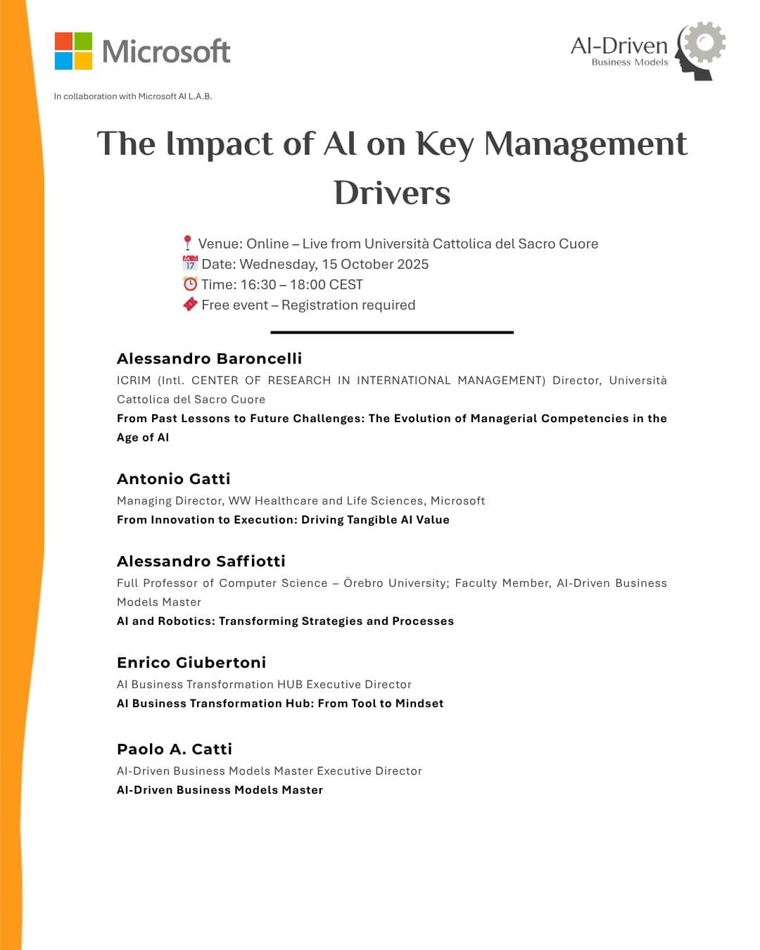 Join the AIDBM Executive Webinars and strategic events hosted by Università Cattolica to explore the future of AI-driven business strategy, governance, and innovation. These exclusive sessions connect academia, industry leaders, and global professionals.